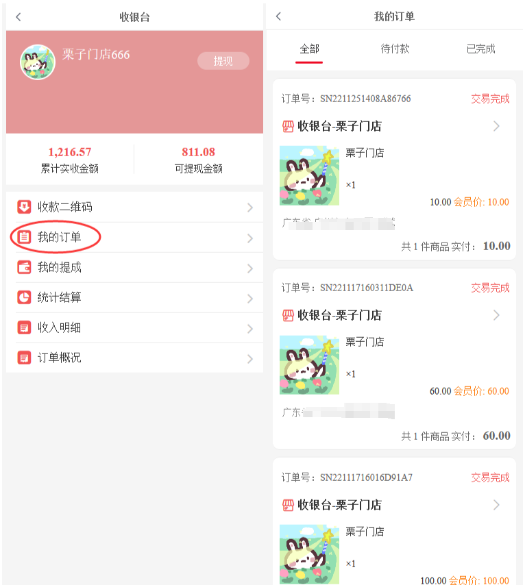门店商品和收银台订单是区分开,在对应管理中点击查看