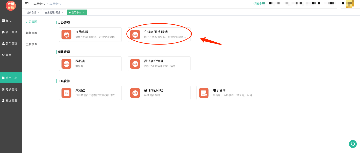 登录企业管理PC端,在左侧导航--在线客服,应用--在线客服 客服端都可以访问在线客服 客服端页面: